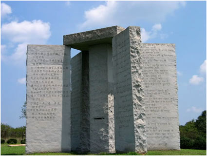 Monumen Georgia Stone tersebut berisi 10 aturan dalam “New World Order”. Dalam baris pertama yakni: “1. Maintain humanity under 500,000,000 in perpetual balance with nature.” yang artinya 93% ras manusia harus dimusnahkan !