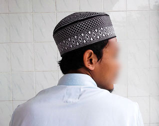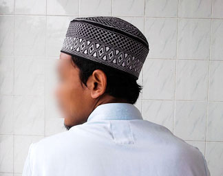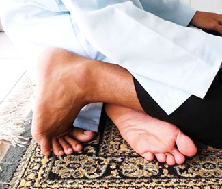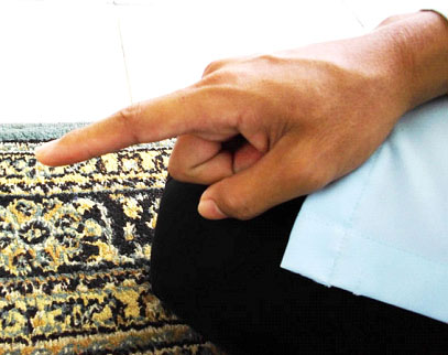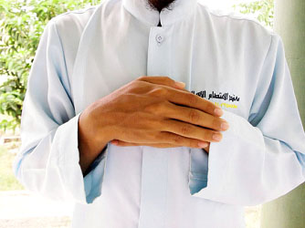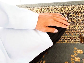 B-3.  Posisi telapak tangan kanan menggenggam punggung tangan kiri, saat kondisi jamaah sholat padat.