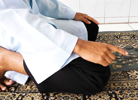 Saat Tasyahud Awwal hendaknya anda MEMBACA SHOLAWAT atas Nabi صلى الله عليه وسلم. Dan pada keduanya (baik Tasyahud Awwal maupun Tasyahud Akhir), sejak awal anda hendaknya memberi isyarat dengan telunjuk anda mengacung keatas kearah Kiblat, sembari menggetarkannya dengan gerakan halus.