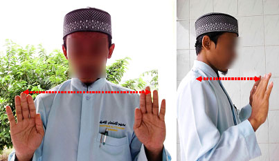 Jadi ada 2 pilihan bagi posisi mengangkat tangan tersebut, boleh sejajar dengan bahu, dan boleh pula sejajar dengan kedua daun telinga.