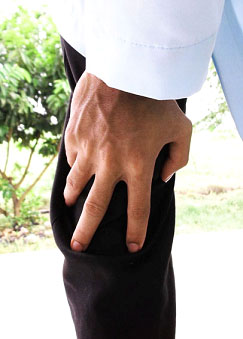 B-2.  Posisi telapak tangan kanan menggenggam pergelangan tangan kiri, saat kondisi jamaah sholat agak padat.