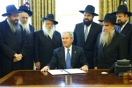 George W. Bush bersama Yahudi (“Kami, orang-orang Yahudi, mengontrol Amerika, dan orang-orang Amerika mengetahui hal itu – Perdana Mentri Israel, Ariel Sharon, 3 Oktober 2001) *