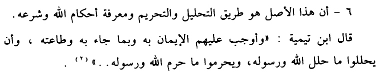 “Karena itu Hujjah (argumentasi) yang Wajib untuk diikuti adalah Al Qur’an, As Sunnah dan Al Ijma’, yang demikian itu adalah kebenaran yang tidak ada kebathilan di dalamnya. Karena itu Wajib untuk diikuti dan tidak boleh ditinggalkan dalam keadaan apa pun. Secara umum adalah Wajib, dan tidak boleh meninggalkan apa pun yang ditunjukkan oleh pokok-pokok ini, dan siapapun tidak diperkenankan untuk keluar dari apa yang telah ditunjukkan oleh Hujjah ini. Dan itu terbangun diatas 2 (dua) pokok: (Pertama), Hal ini berasal dari Rosuulullooh صلى الله عليه وسلم . (Kedua), Apa saja yang berasal dari Rosuulullooh صلى الله عليه وسلم Wajib diikuti; yang keduanya ini adalah merupakan keimanan dimana berlawanan dengannya adalah kekufuran dan kemunafikan.” [32]