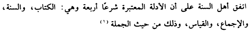 “Ahlus Sunnah Wal Jama’ah sepakat bahwa Dalil yang permanen secara Syar’i ada 4, yaitu: (1) Al Qur’an; (2) As Sunnah; (3) Al Ijma’; (4) Al Qiyas. Dan itu adalah secara global.”[2]