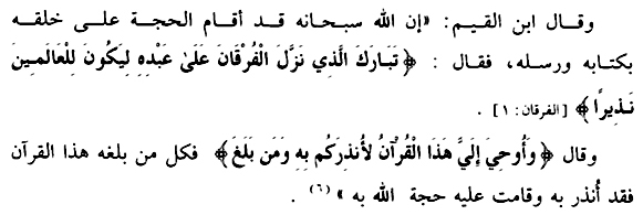 “Sesungguhnya Allooh سبحانه وتعالى telah menegakkan hujjah pada makhluq-Nya, dengan melalui Kitab-Nya (Al Qur’an) dan Rosuul-Rosuul-Nya. Allooh سبحانه وتعالى berfirman, “Maha Suci Allah yang telah menurunkan Al Furqan (Al Qur’an) kepada hamba-Nya, agar dia menjadi pemberi peringatan kepada seluruh alam – (QS. Al Furqon ayat 1) [18]. Dan Allooh سبحانه وتعالى berfirman, “Dan Al Qur’an ini diwahyukan kepadaku supaya dengannya aku memberi peringatan kepadamu dan kepada orang-orang yang sampai Al Qur’an (kepadanya)” – (QS. Al An’aam ayat 19). Dengan demikian setiap orang yang sudah sampai kepadanya Al Qur’an, berarti orang itu telah diberi peringatan. Dan Hujjah Allooh سبحانه وتعالى berarti telah tegak padanya.”[19]
