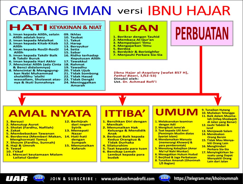 Seorang ‘Ulama Ahlus Sunnah Wal Jama’ah yang bernama Ibnu Hajar al-Asqolany rohimahullooh telah menjabarkan tentang Cabang-Cabang Iman di dalam kitab Fathul Baari, Jilid 1 halaman 52-53, yang mencakup 24 Amalan Hati (Keyakinan/Niat), 7 Amalan Lisan dan 38 Amal Perbuatan (dalam bentuk Amalan Nyata, Ittiba’ dan Amalan terkait urusan Umum) sebagai berikut: