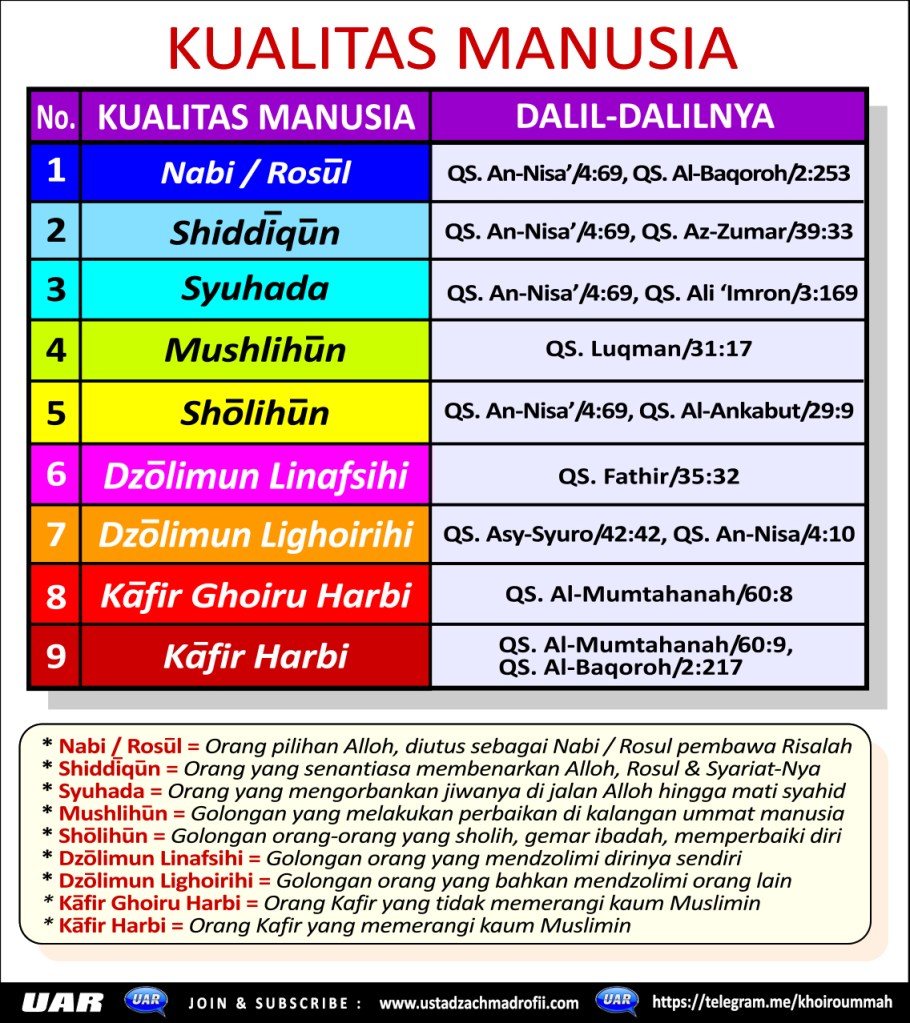 Setelah mengetahui adanya 9 tingkatan Kualitas Manusia ditinjau dari keimanannya; maka hendaklah kita mulai sering menghisab diri, merenungkan dimanakah kiranya posisi kita dalam pandangan Allooh سبحانه وتعالى. Berusahalah agar berada di posisi 2, 3, 4 atau 5; dan jika merasa sudah di posisi 6 maka sadarilah bahwa itu sudah merupakan “lampu kuning”/tanda bahaya, segera perbaiki Iman disisi Allooh سبحانه وتعالى. Dan jauhilah serta hindarkanlah diri agar jangan sampai masuk kedalam posisi no: 7, apalagi 8 maupun 9 (dengan menjadi orang murtad yang bergabung ke golongan Kafir). Semoga Allooh سبحانه وتعالى senantiasa menjaga diri-diri kita agar istiqomah dalam Iman Islam hingga akhir hayat.