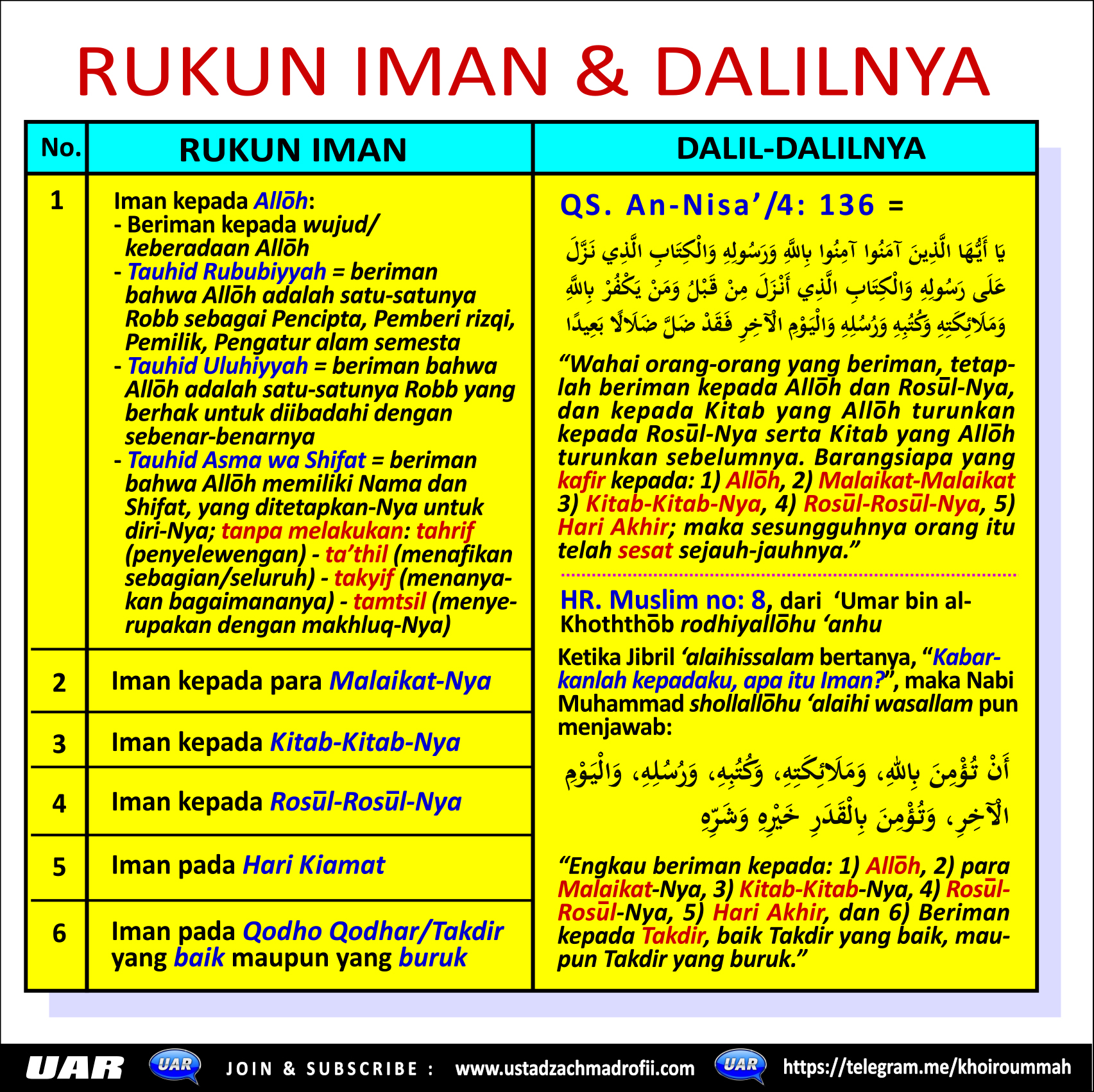 Tentang Rukun Iman beserta dalil-dalilnya maka dapat dilihat pada Bagan-1. Rukun Iman dan Dalilnya di bawah ini, yang merupakan ringkasan dari apa yang telah kita kaji beberapa waktu yang lalu: