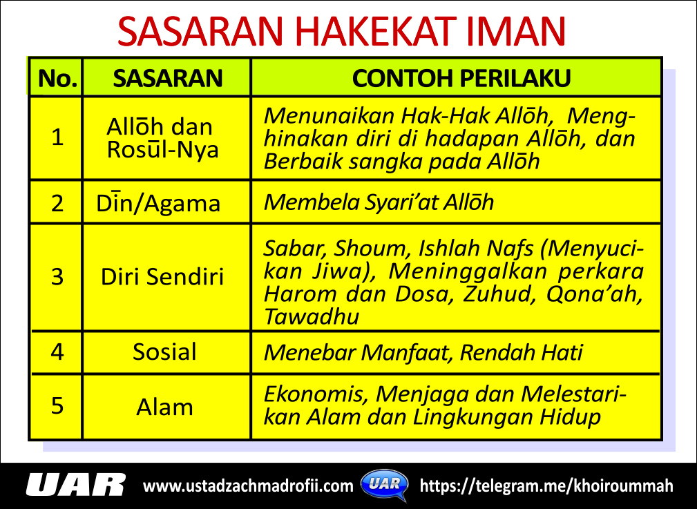 Oleh karena Hakekat Iman pada seseorang itu pastilah tercermin dalam Amalan Hati, Lisan dan Perbuatan Anggota Tubuhnya; maka berikut ini adalah diantara apa yang menjadi sasaran/tujuan dari Hakekat Iman yang ada pada diri seseorang dalam perilaku kehidupannya sehari-hari, yakni sebagaimana digambarkan pada Bagan-5. Sasaran Hakekat Iman dibawah ini.