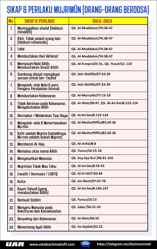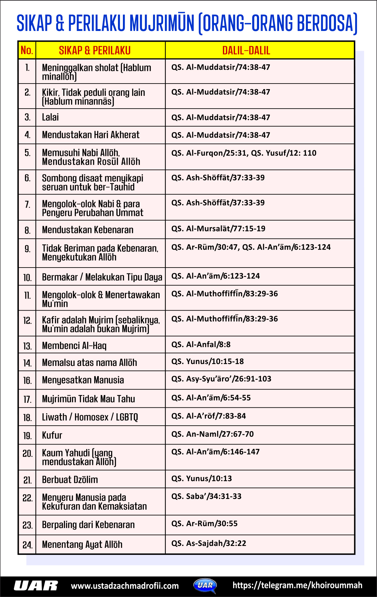 QS. Al-Muddatsir/74: 38-47 menjelaskan tentang 4 jenis perilaku orang-orang yang tergolong Mujrimũn, yakni: (1) Ia melalaikan sholat, padahal sholat itu adalah Hak Allōh سبحانه وتعالى (Hablum Minallōh), (2) Ia berperilaku kikir, tidak peduli dan masa bodoh terhadap orang-orang miskin disekitarnya padahal ia mampu menolong mereka (Hablum Minannãs), (3) Ia lalai, hidup semaunya sendiri, bahkan bergelut dalam kebathilan, (4) Mendustakan Hari Akherat.