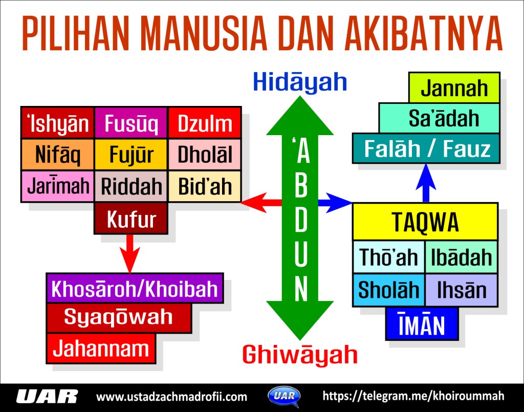 Apabila sang Manusia sadar (memperoleh Hidãyah) untuk apa dirinya diciptakan, lalu ia pun berjuang dan ber-Amal Shōlih sesuai tuntunan Pencipta dirinya; sehingga selama di dunia ia pun memilih pilihan-pilihan hidupnya untuk selalu berusaha menjadi golongan Hamba yang Taat (bagian kanan Gambar #1), maka dengan “mahar” berupa: 1) Imãn, 2) Ihsãn, 3) Sholãh (Sholat), 4) Ibãdah, 5) Thō’ah (Taat pada Allōh dan Rosũl-Nya), serta 6) Taqwa; maka sebagai balasannya ia di Akherat kelak berhak atas: 1) Falãh / Fauz (orang yang menikmati Surga), 2) Sa’ãdah (bahagia abadi), dan 3) Jannah (Surga).