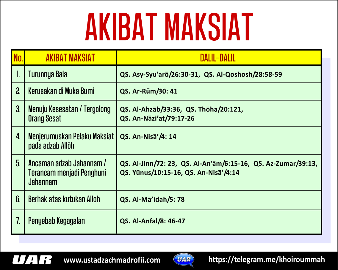 “Dan Maksiat mempunyai akibat yang tercela serta merugikan bagi hati maupun fisik/tubuh, baik di dunia dan di akhirat: (1) Sulit memahami ilmu (din/agama – pent.); (2) Sulitnya rizqi; (3) “Rasa jauh/kesepian di dalam hati antara dirinya dengan Allōh Tuhannya”, yang dirasakan oleh orang yang bermaksiat itu, yang mana hal tersebut tidak dapat dibandingkan dengan kesenangan apa pun, bahkan jika kesenangan seluruh dunia digabungkan sekalipun; (4) Kesenjangan yang terjadi antara dirinya dan orang lain; (5) “Kegelapan” yang ia temukan di dalam hatinya sebagai suatu kenyataan yang ia rasakan akibat maksiatnya; sebagaimana gelap gulitanya malam, maka kegelapan kemaksiatan itu menjelma menjadi kegelapan pula di dalam hatinya. Dan juga menjadi kegelapan bagi mata hatinya, karena ketaatan adalah cahaya, dan kemaksiatan adalah kegelapan; (6) Maksiat melemahkan serta membuat rapuh baik hati maupun tubuh; (7) Kurangnya ketaatan, akibat begitu banyak ketaatan yang terputus darinya disebabkan oleh maksiat; (8) Maksiat itu berdampak memperpendek umur dan menghilangkan nikmatnya, maka tidak bisa dihindari bahwa sebagaimana keshōlihan itu menambah umur, maka maksiat itu memperpendek umur.”