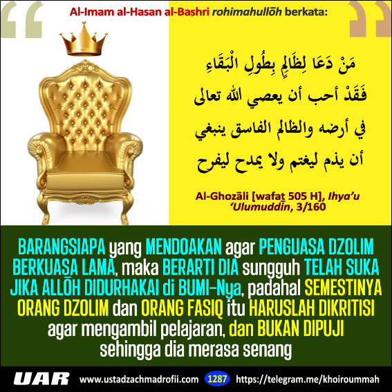 Dalam Kitab “Adab Ad-Dunya wad Dĩn” hal. 135, Al-Imam al-Mawardi rohimahullōh (wafat 450 H), seorang ‘Ulama Ahlus Sunnah telah menjelaskan tentang betapa pentingnya memiliki penguasa yang adil, yang tunduk pada Syari’at Allōh سبحانه وتعالى, yang bekerja untuk menerapkan Syari’at-Nya terhadap rakyatnya di negeri-negeri milik Allōh سبحانه وتعالى; karena Keadilan itu baru bisa tegak apabila Hukum / Syari’at Allōh (Pemilik langit dan bumi beserta seluruh makhluq-Nya) itulah yang digunakan serta dilaksanakan sebagai Pedoman Hidup keselamatan dunia akherat. Dan sungguh, apabila seorang Pemimpin / Sulthōn / Kholĩfah itu adil, maka ia akan lebih takut kepada Allōh سبحانه وتعالى, dan takut akan pertanggungjawabannya sebagai Pemimpin di Hari Akherat kelak, sehingga ia akan mengontrol Hawa Nafsunya, ia akan berusaha tegak diatas Syari’at-Nya; dan kalau rakyat suatu negeri memiliki Pemimpin dengan karakter yang takut pada Allōh seperti ini, maka in-sya Allōh orang-orang dzōlim tidak akan berani berkutik dibawah kepemimpinannya sehingga kedzōliman akan terbendung.