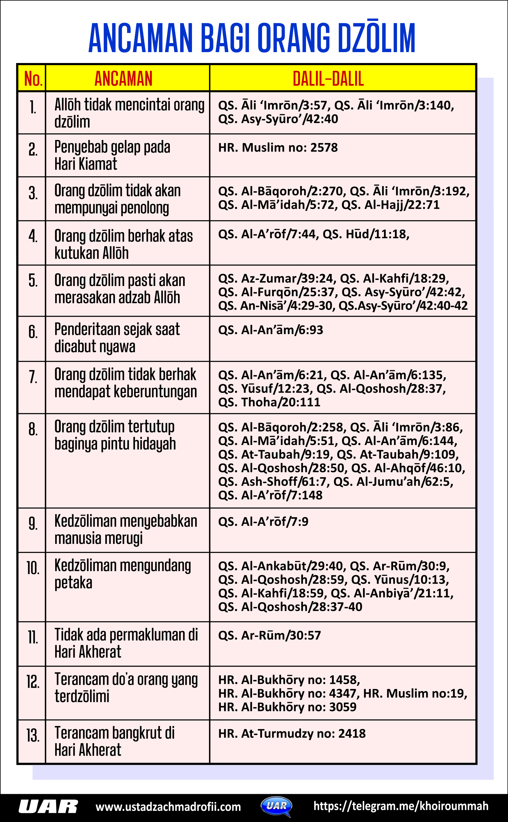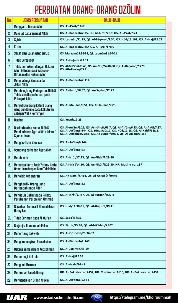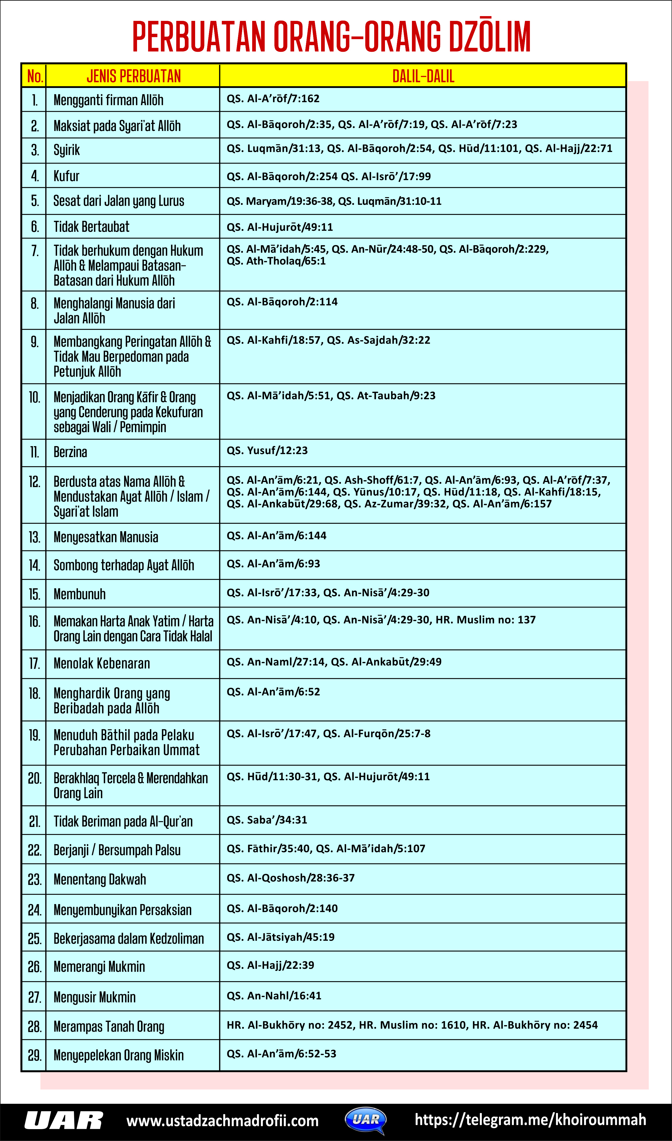 Demikianlah 29 poin yang menjelaskan perbuatan apa saja yang termasuk kedzōliman; yang dirangkum dalam Bagan berikut ini.